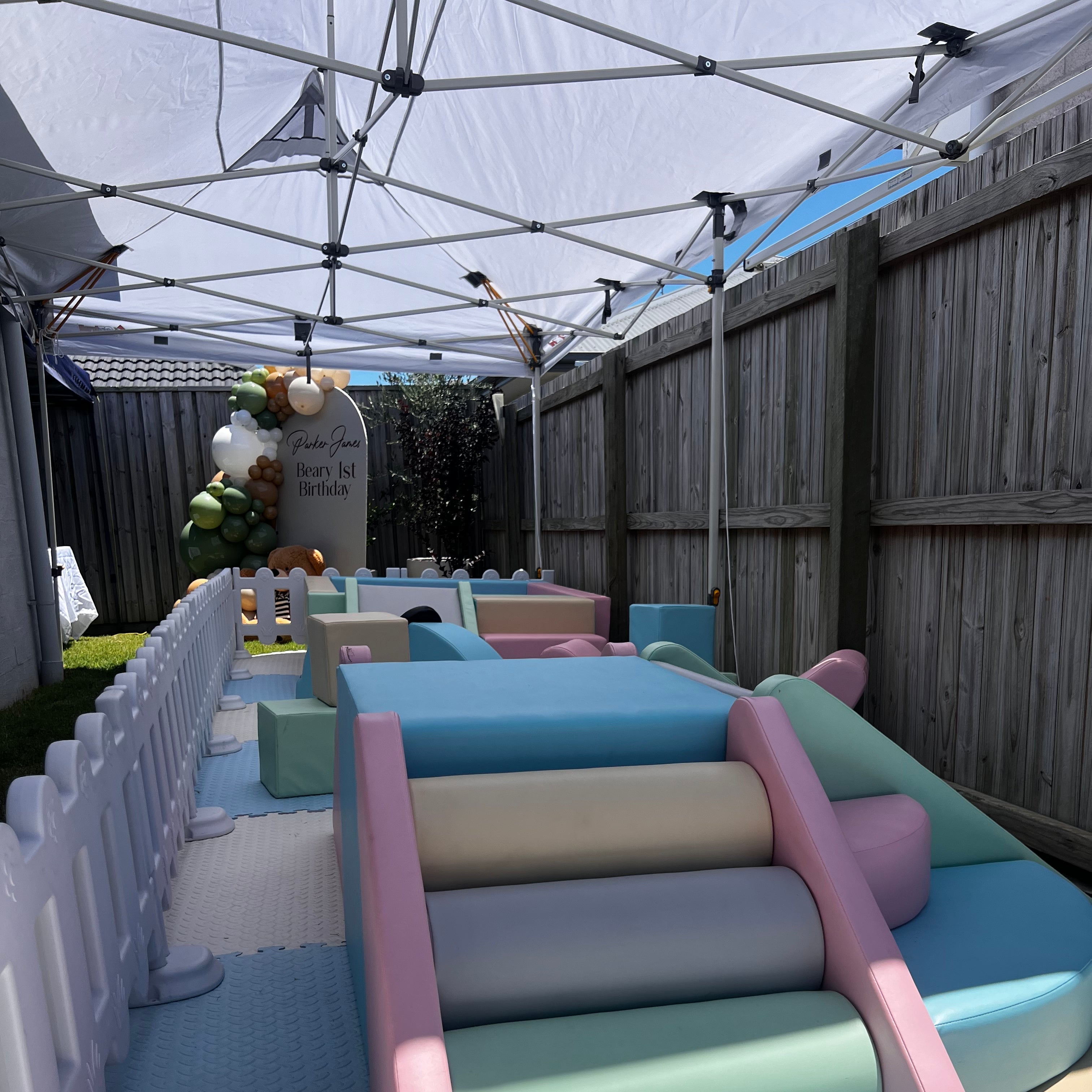 Full Softplay Package with ballpit, climber, and slide in pastel colours. Ideal for large events. Price excludes delivery & setup fees. All softplay packages come with fully enclosed fencing + gate and your choice of blue/white or pink/white checked matt pattern base.